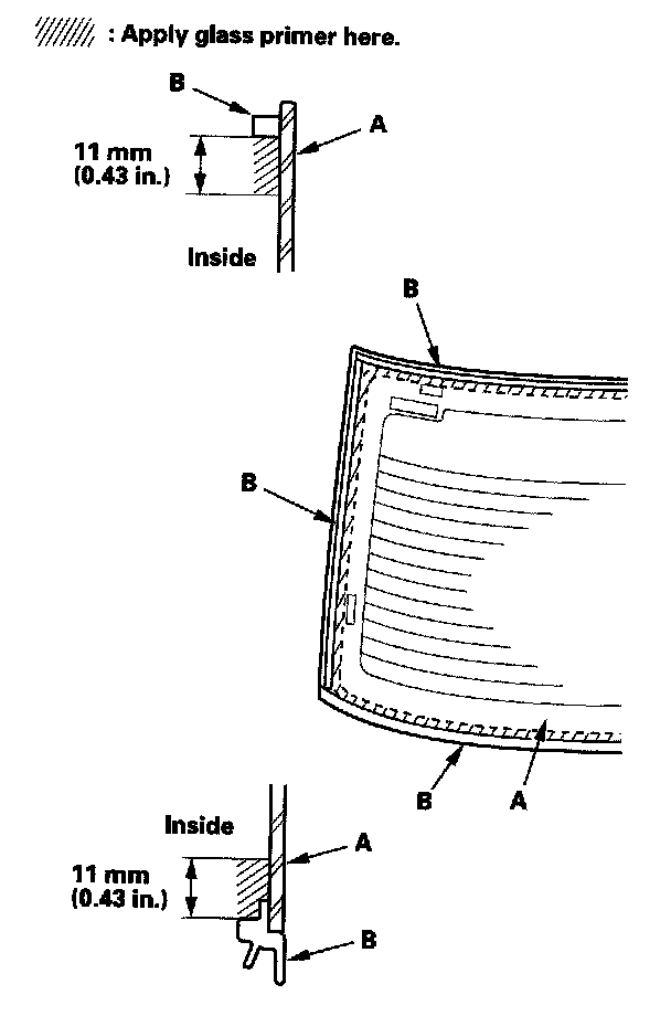 17. With a sponge, apply a light coat of glass primer along the edge of the rear window (A) between the dams (B) as shown, then lightly wipe it off with gauze or cheesecloth: