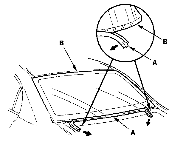 6. Remove the lower rubber dam (A) from the lower edge of the rear window (B). If necessary, cut the molding with a utility knife.