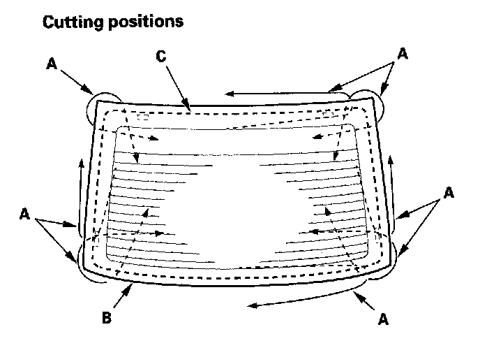 7. With a helper on the outside, pull the piano wire (A) back and forth in a sawing motion. Hold the piano wire as close to the rear window (B) as possible to prevent damage to the body, and carefully cut through the adhesive (C) around the entire rear window.
