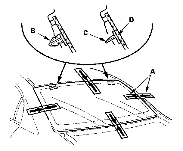 15. Set the rear window in the opening, and center it. Make alignment marks (A) across the rear window and body with a grease pencil at the four points shown. Make sure both clips (B) are in the body holes (except USA produced models). Make sure both pins (C) from the upper fasteners (D) contact with the edge of the body holes (USA produced models). Be careful not to touch the rear window where adhesive will be applied.