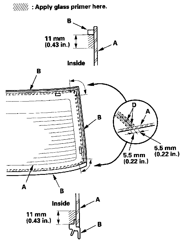 - With the printed dots (D) on the rear window as a guide, apply the glass primer to both lower corner portions of the rear window.