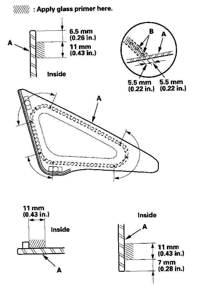 8. With a sponge, apply a light coat of glass primer to the inside face of the front corner glass (A) as shown, then lightly wipe it off with gauze or cheesecloth:
