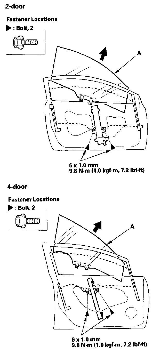 4. Carefully raise the glass (A) until you can see the bolts, then remove them. Carefully pull the glass out through the window slot. Take care not to drop the glass inside the door.
