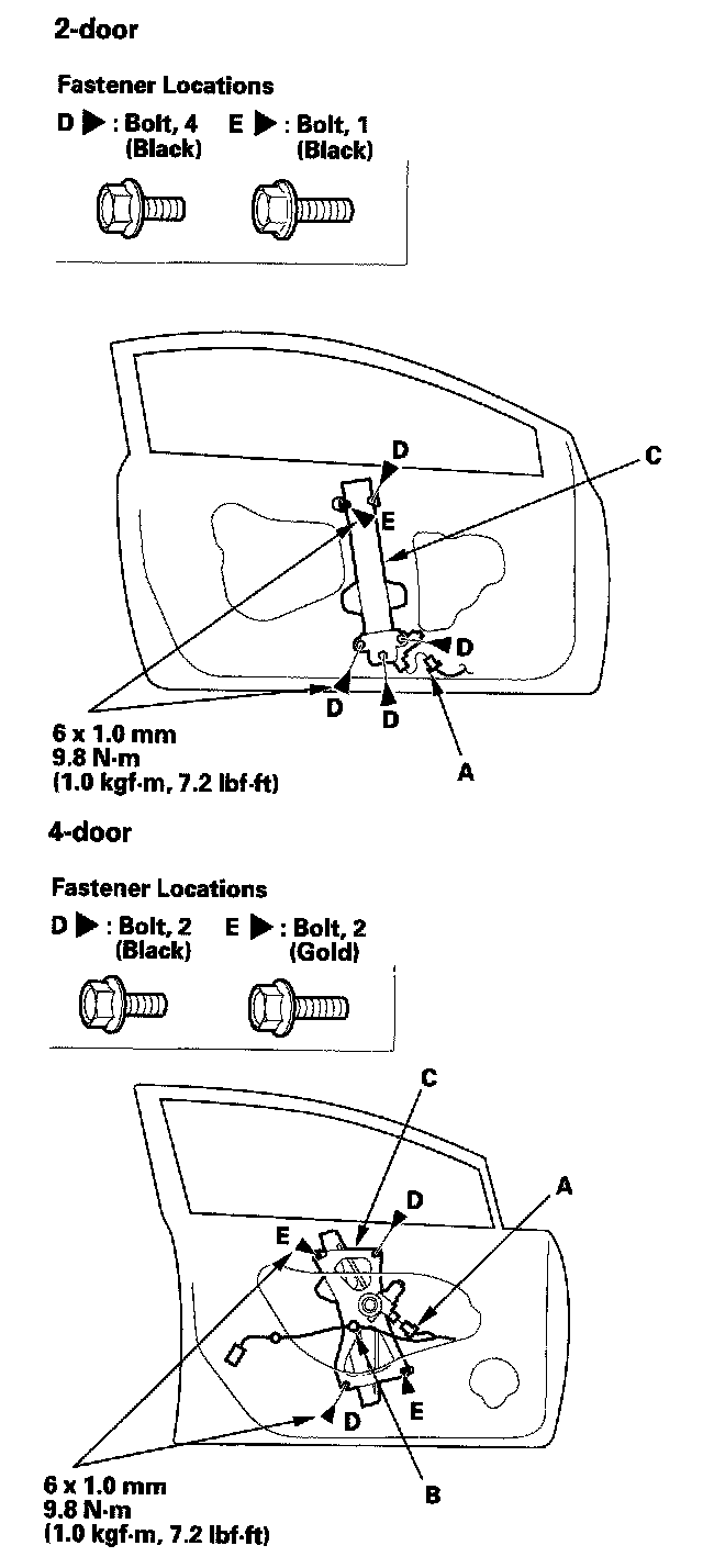 6. Remove the bolts (D), and loosen the bolts (E), then remove the regulator through the hole in the door.