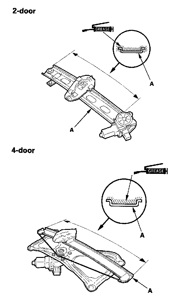 7. Apply multipurpose grease to all the sliding surfaces of the regulator (A) where shown.