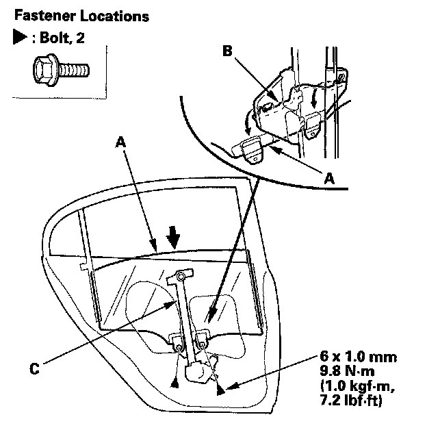 4. Carefully move the glass (A) until you can see the bolts, then remove them. Release the glass from the holder (B), then remove it from the regulator (C), and carefully lower the glass. Take care not to drop the glass inside the door.