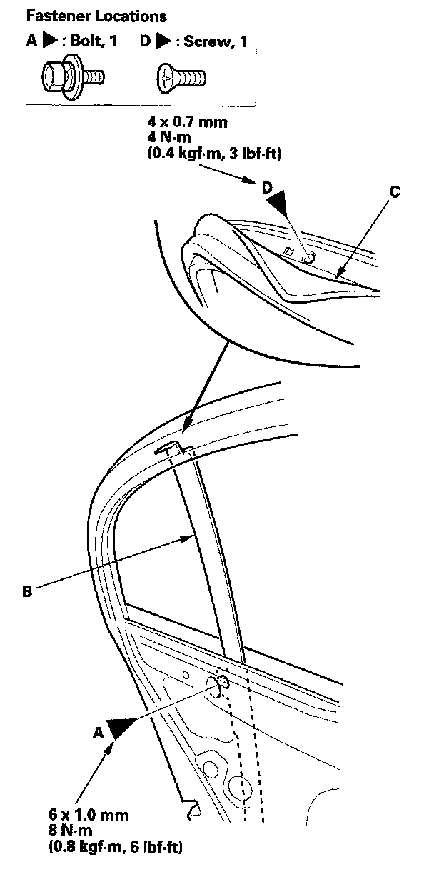 5. Remove the bolt (A) from the rear lower channel (B). Pull the glass run channel (C) away as needed, and remove the screw (D).