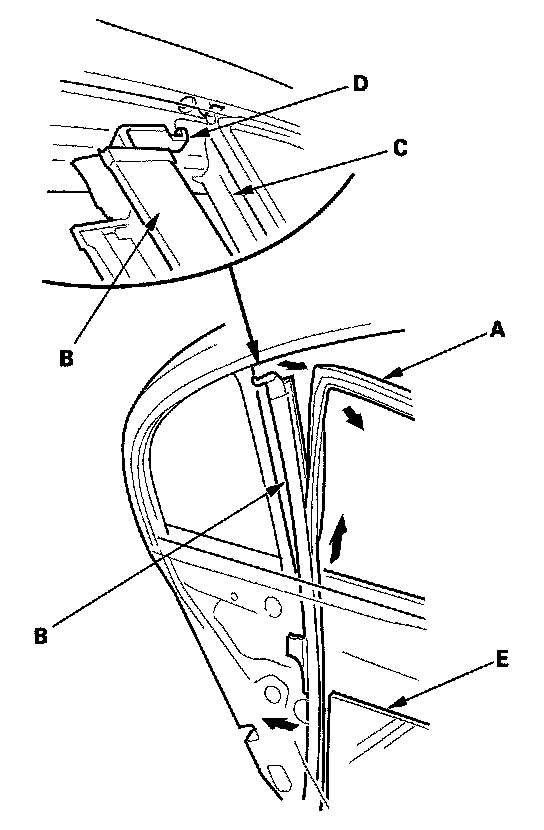 6. Pull the glass run channel (A) away as needed. Pull the rear lower channel (B) forward from the quarter glass seal (C) then release the upper hook (D) from the door. Remove the rear lower channel from the rear door glass (E), then pull the channel up to remove it.
