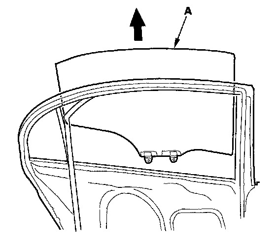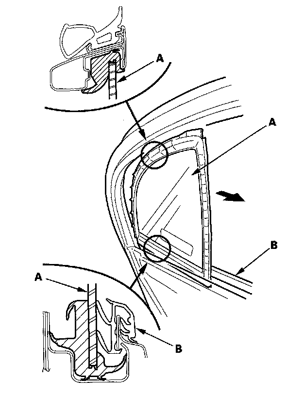9. Remove the quarter glass (A). Take care not to damage the outer weatherstrip (B).