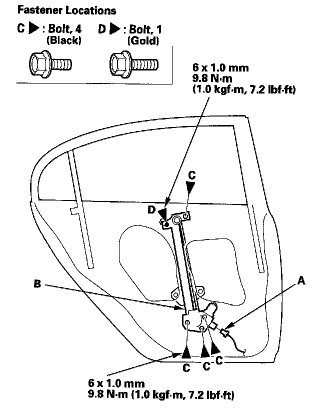 11. Remove the bolts (C), and loosen the bolt (D), then remove the regulator through the hole in the door.