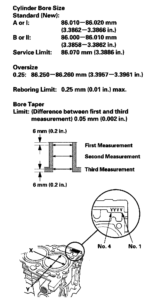 4. Measure the wear and taper in direction X and Y at three levels in each cylinder as shown. If the measurements in any cylinder are beyond the Oversize Bore Service Limit, replace the engine block. If the engine block is being rebored, refer to step 7 after reboring.