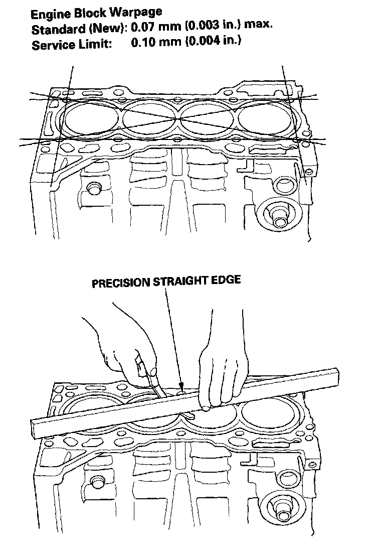 6. Check the top of the engine block for warpage. Measure along the edges, and across the center as shown.