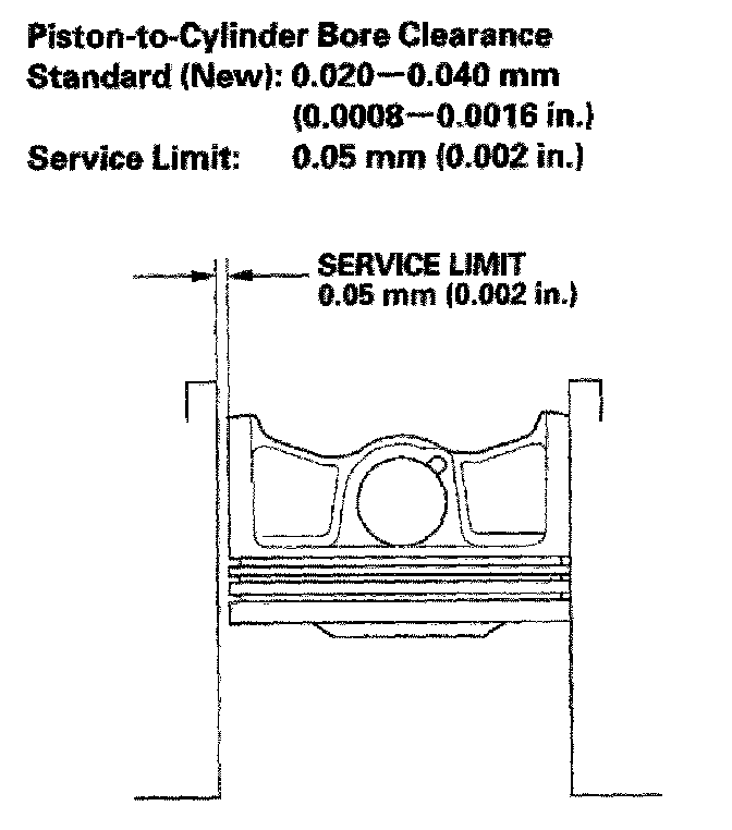 7. Calculate the difference between the cylinder bore diameter and the piston diameter. If the clearance is near or exceeds the service limit, inspect the piston and cylinder bore for excessive wear.