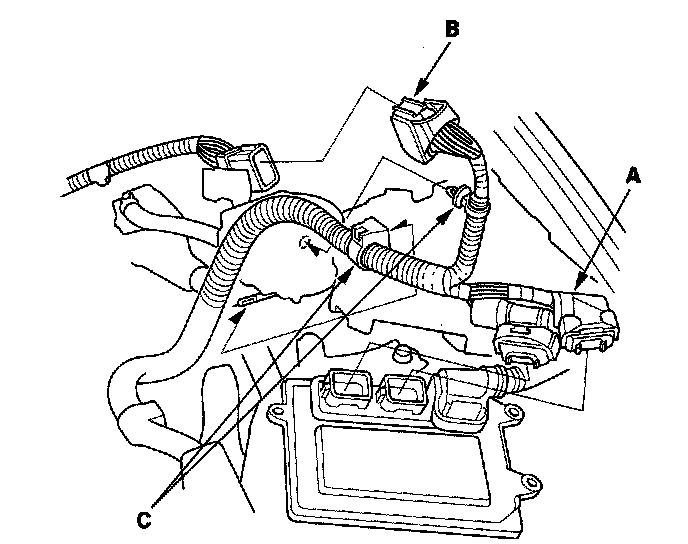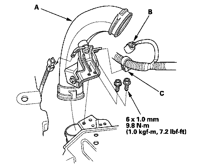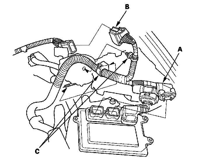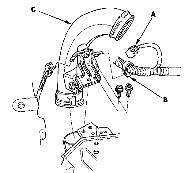 8. Disconnect the connector (A), and remove the harness clamp (B), then remove the resonator (C).