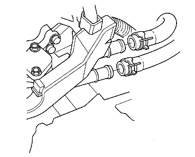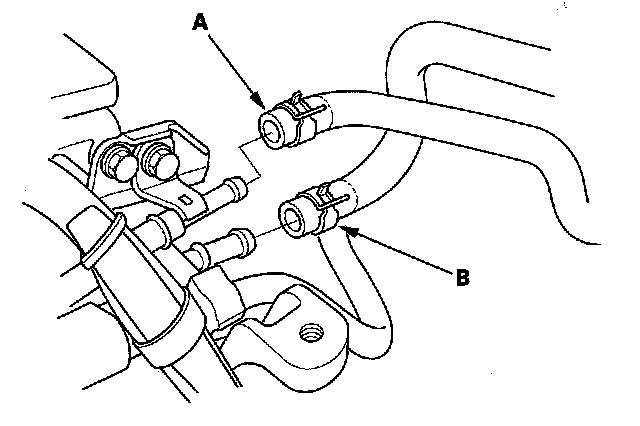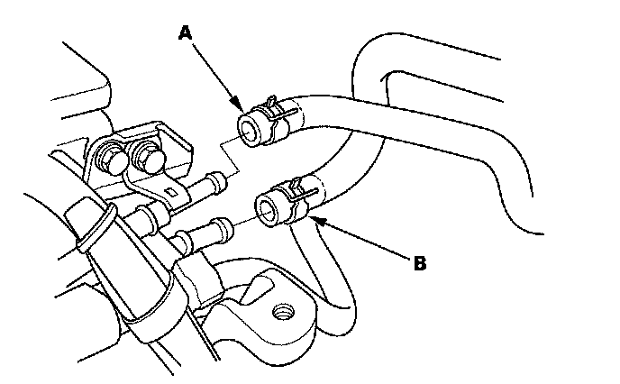 15. Remove the evaporative emission (EVAP) canister hose (A) and brake booster vacuum hose (B).