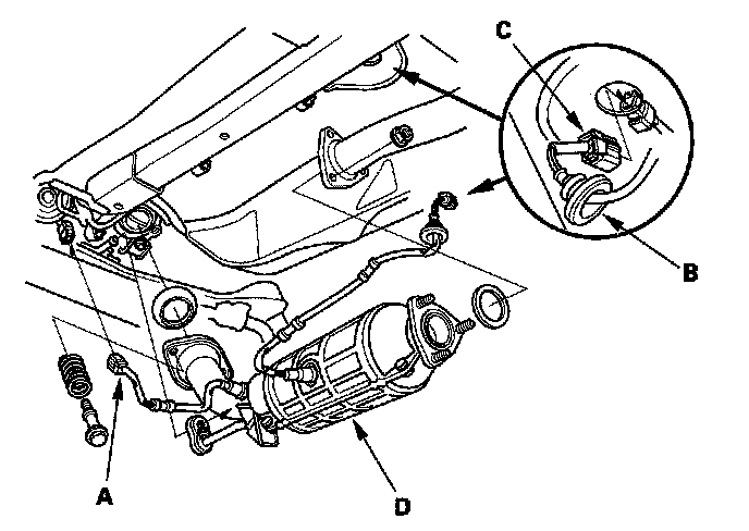 29. Remove the grommet (B), then disconnect the secondary heated oxygen sensor (secondary H02S) connector (C).