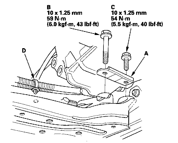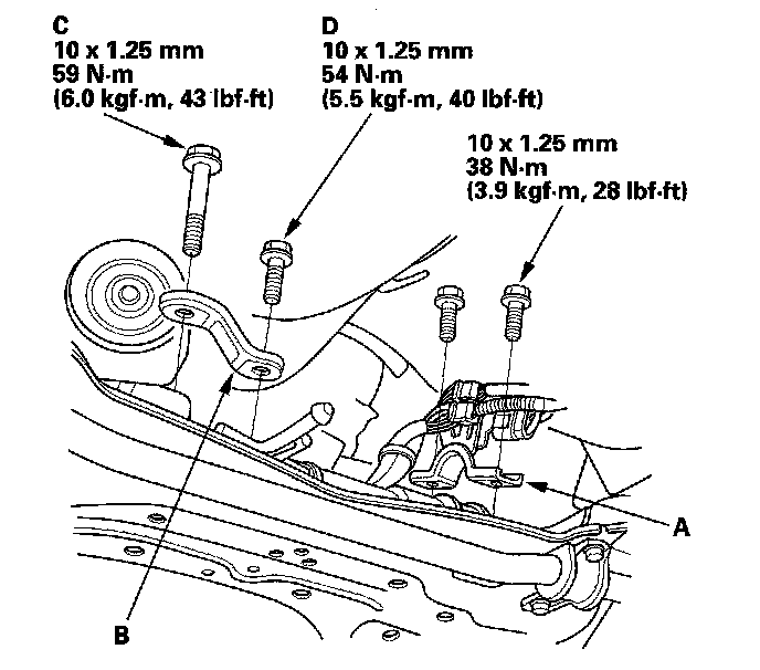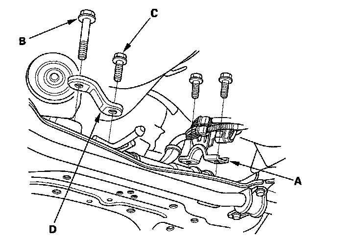 28. Install the stiffener (B), then tighten the steering gearbox mounting bolt (C) and stiffener mounting bolt (D).