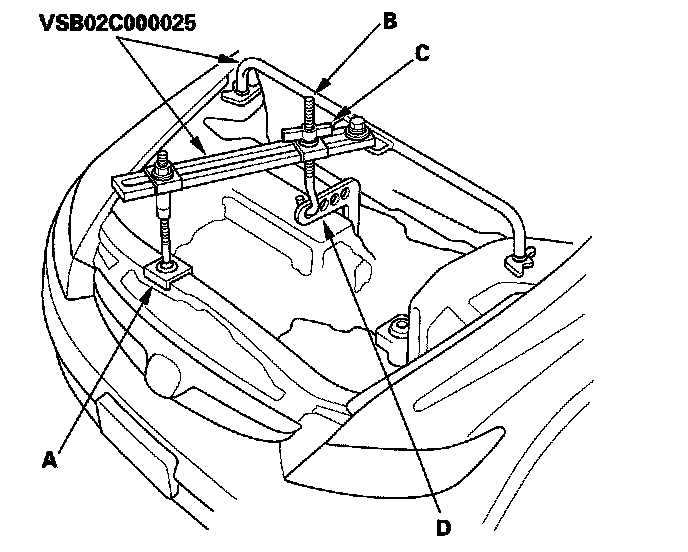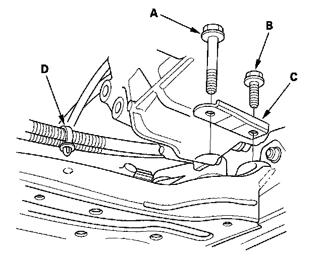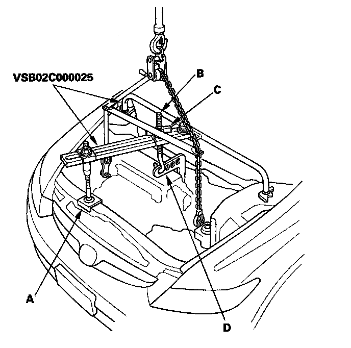 4. Install the front leg assembly (A), hook (B), and wing nut (C) from an A and Reds engine support hanger (AAR-T-12566) onto the engine hanger. Carefully position the engine hanger on the vehicle, and attach the hook to the forward hole in the engine hanger adapter (D). Tighten the wing nut by hand to lift and support the engine/transmission.
