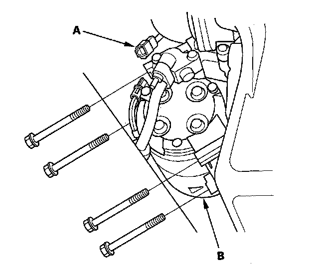 38. Disconnect the A/C compressor clutch connector (A), then remove the A/C compressor (B) without disconnecting the A/C hoses.