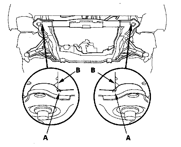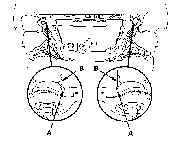 14. Align the front subframe reference marks (A) to the body (B), as noted during removal. Tighten the bolts on the front subframe to the specified torque.