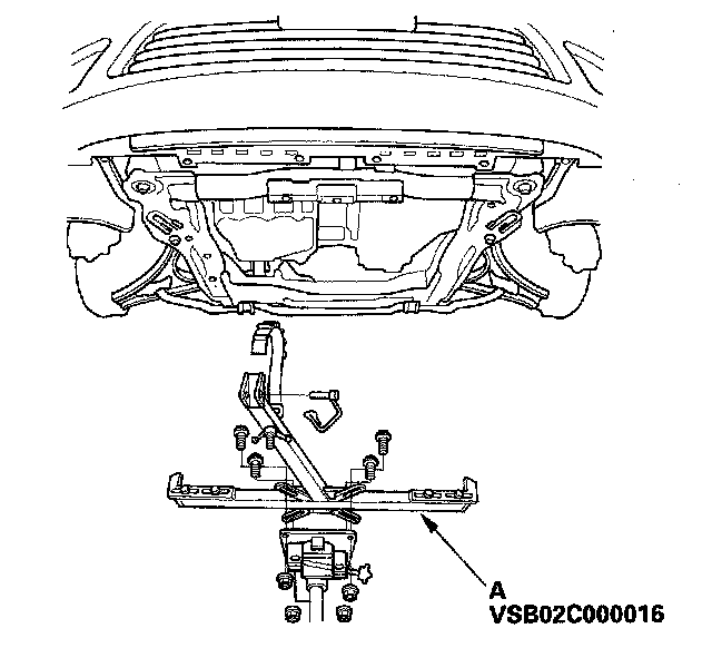 11. Set the front subframe adapter (A) to the front subframe and hang the belt of the front subframe adapter over the front of the subframe, then secure the belt with its stop.