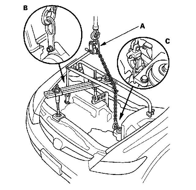 56. Attach a chain hoist (A) to the special tool (B), and the transmission hook (C). Lift up on the engine/transmission until it's securely supported by the chain hoist, and remove the engine hanger.