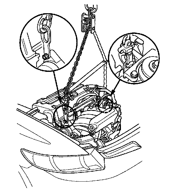 2. Raise the vehicle on the hoist, and position the engine/transmission under the vehicle. Lower the vehicle, and attach the special tool and chain hoist to the engine, then lift the engine into position in the vehicle.