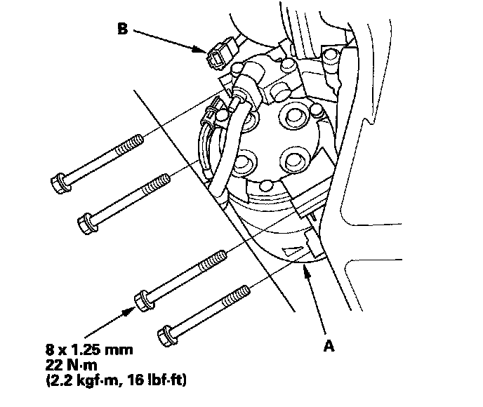24. Install the A/C compressor (A), then connect the A/C compressor clutch connector (B).