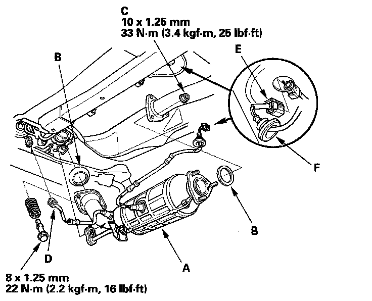 34. Connect the secondary heated oxygen sensor (secondary H02S) connector (E), then install the grommet (F).