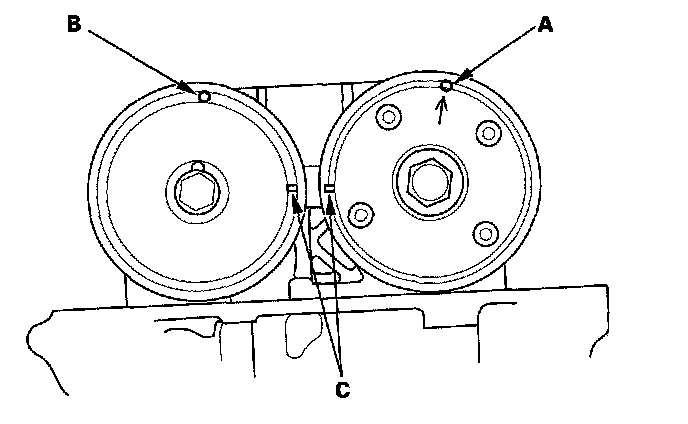 2. Set the camshafts to TDC. The punch mark (A) on the variable valve timing control (VTC) actuator and the punch mark (B) on the exhaust camshaft sprocket should be at the top. Align the TDC marks (C) on the VTC actuator and exhaust camshaft sprocket.