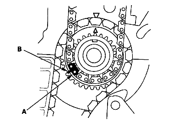 1. Set the crankshaft to top dead center (TDC). Align the TDC mark (A) on the crankshaft sprocket with the pointer (B) on the engine block.