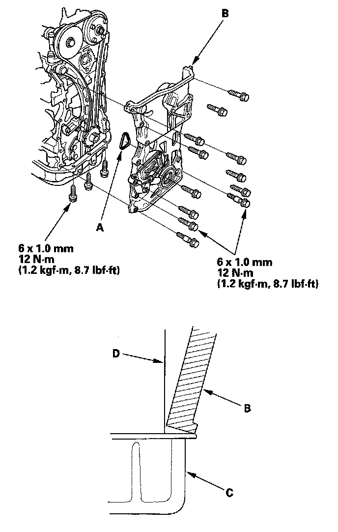 15. Install a new O-ring (A) on the chain case. Set the edge of the chain case (B) to the edge of the oil pan (C), then install the chain case on the engine block (D). Wipe off the excess liquid gasket on the oil pan and chain case mating area.