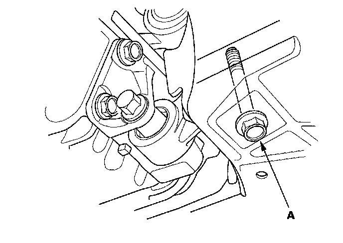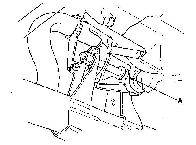 17. Install the side engine mount bracket (A), then loosely tighten the new bolt and nut (B), and loosely tighten the bolt (C).