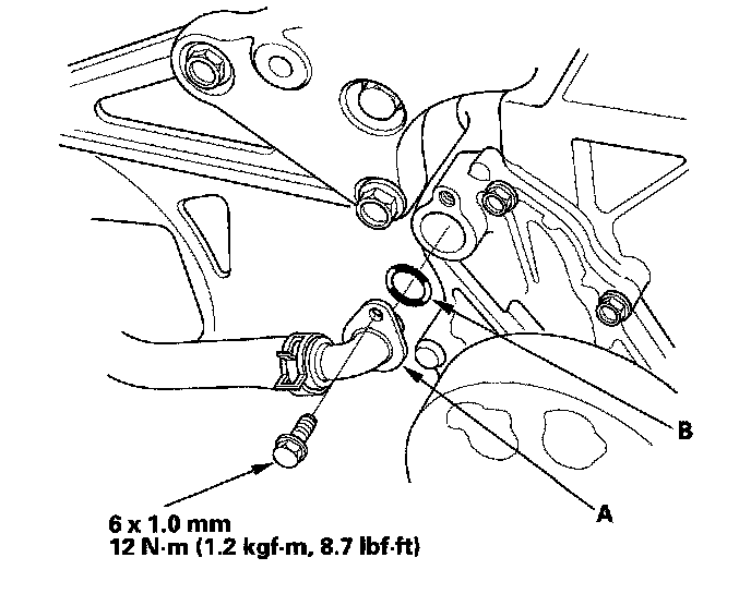 38. Install the oil cooler hose joint pipe (A) with a new O-ring (B).