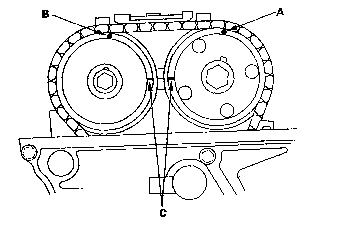 6. Set the No. 1 piston at top dead center (TDC). The punch mark (A) on the variable valve timing control (VTC) actuator and the punch mark (B) on the exhaust camshaft sprocket should be at the top. Align the TDC marks (C) on the VTC actuator an exhaust camshaft sprocket.