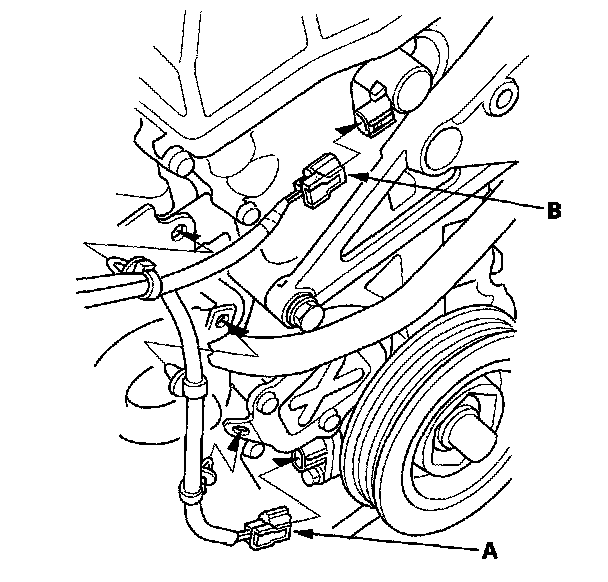 8. Disconnect the crankshaft position (CKP) sensor connector (A) and VTC oil control solenoid valve connector (B).