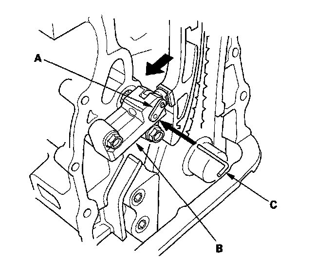 18. Align the holes on the lock (A) and the auto-tensioner (B), then insert a 1.2 mm (0.05 in.) diameter pin or lock pin (P/N 14511-PNA-003) (C) into the holes. Turn the crankshaft clockwise to secure the pin.
