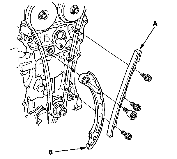 21. Remove the cam chain guide A (A) and tensioner arm (B).
