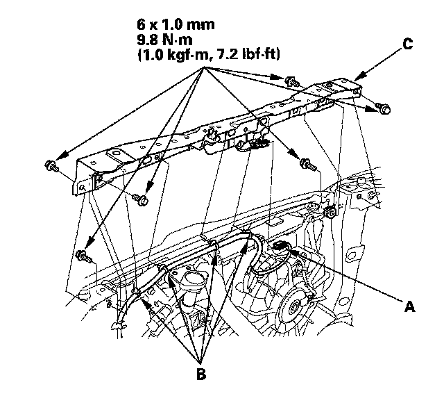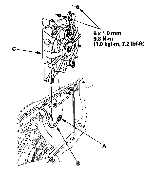 6. Disconnect the connector (A) from the A/C condenser fan motor. Remove the wire harness clip (B), the upper mounting bolts, and the A/C condenser fan shroud (C). Be careful not to damage the radiator fins when removing the A/C condenser fan shroud.