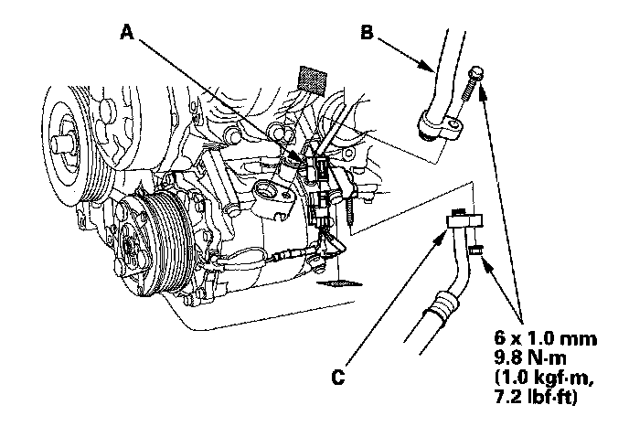 9. Disconnect the connector (A). Remove the bolt and the nut. then disconnect the suction hose (B) and discharge hose (C) from the A/C compressor. Plug or cap the lines immediately after disconnecting them to avoid moisture and dust contamination.