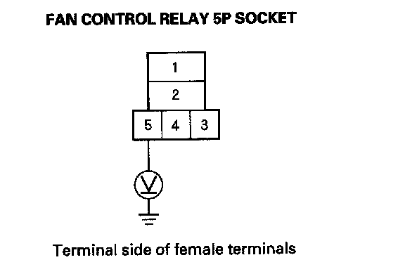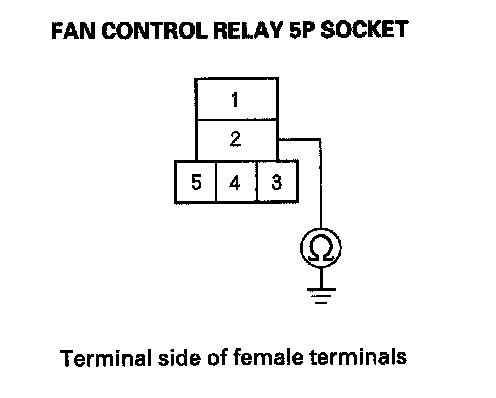 5. Check for continuity between the fan control relay 5P socket terminal No. 2 and body ground.