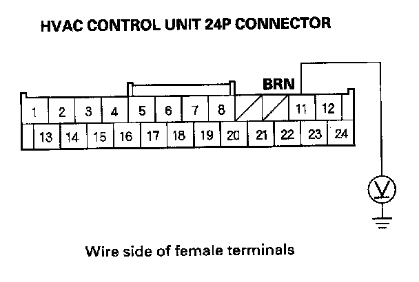 4. Measure the voltage between the HVAC control unit 24P connector terminal No. 11 and body ground.