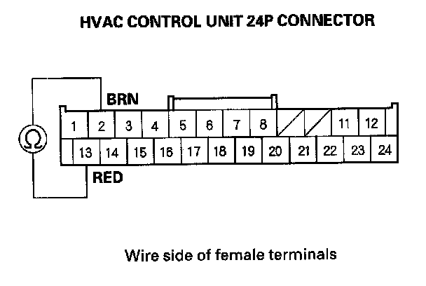12. Measure the evaporator temperature sensor resistance between the HVAC control unit 24P connector terminals No.2 and No. 13.