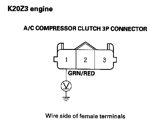 8. K20Z3 engine: Measure the voltage between the A/C compressor clutch 3P connector terminal No.1 and body ground.