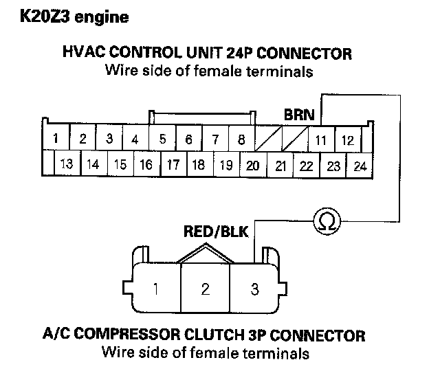 10. K20Z3 engine: Check for continuity between the HVAC control unit 24P connector terminal No. 11 and the A/C compressor clutch 3P connector terminal No. 3.