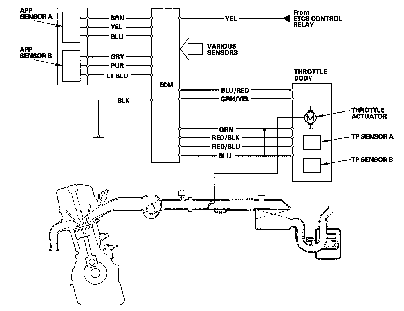 The electronic throttle control system consists of the throttle actuator, throttle position (TP) sensor A/B, accelerator pedal position (APP) sensor A/B, the electronic throttle control system (ETCS) control relay, and the ECM.