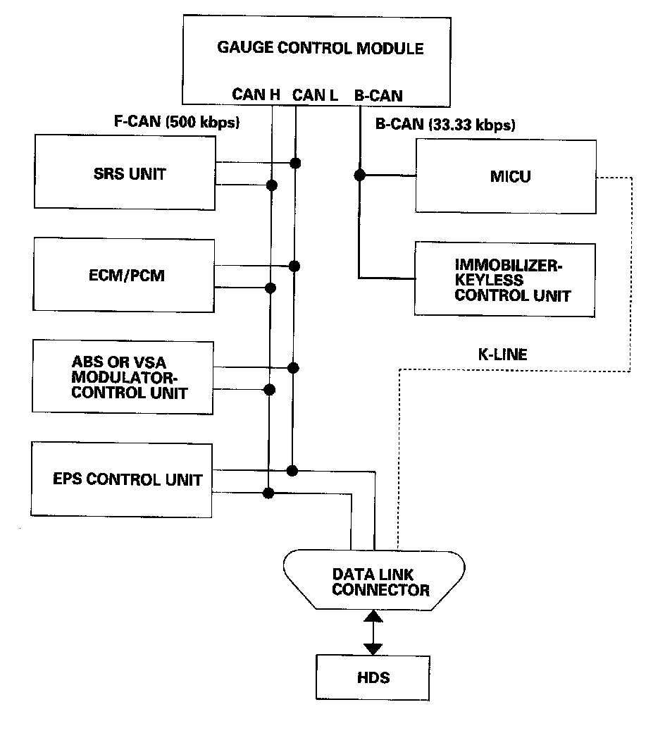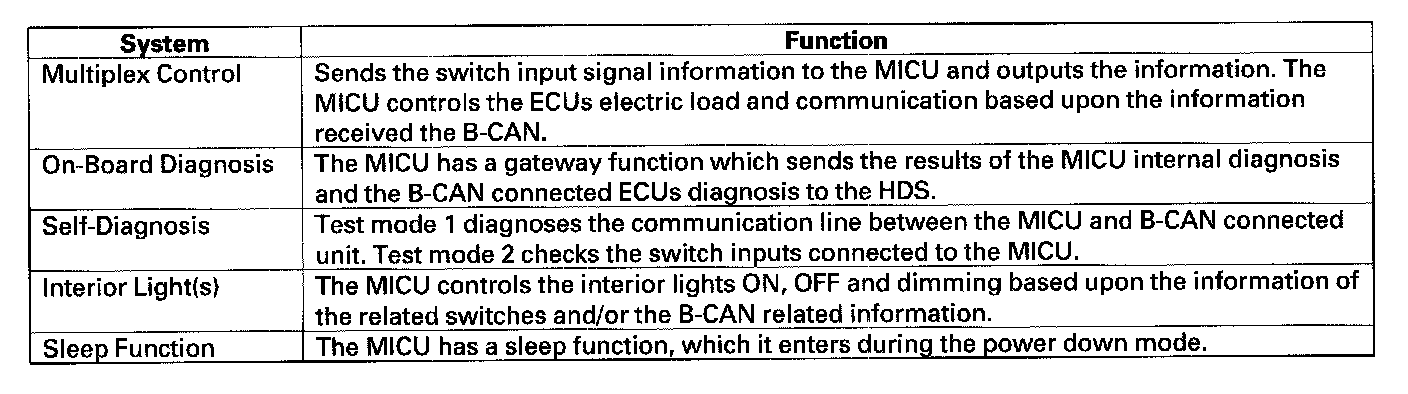 The MICU (built into the under-dash fuse/relay box) is one of the B-CAN components. The MICU controls many systems related to the body controller area and a security system, and also works as a gateway to diagnose the other B-CAN connected ECUs with the HDS.