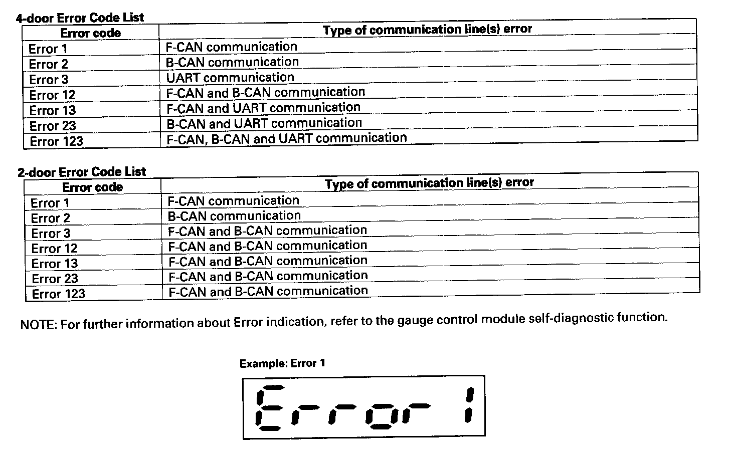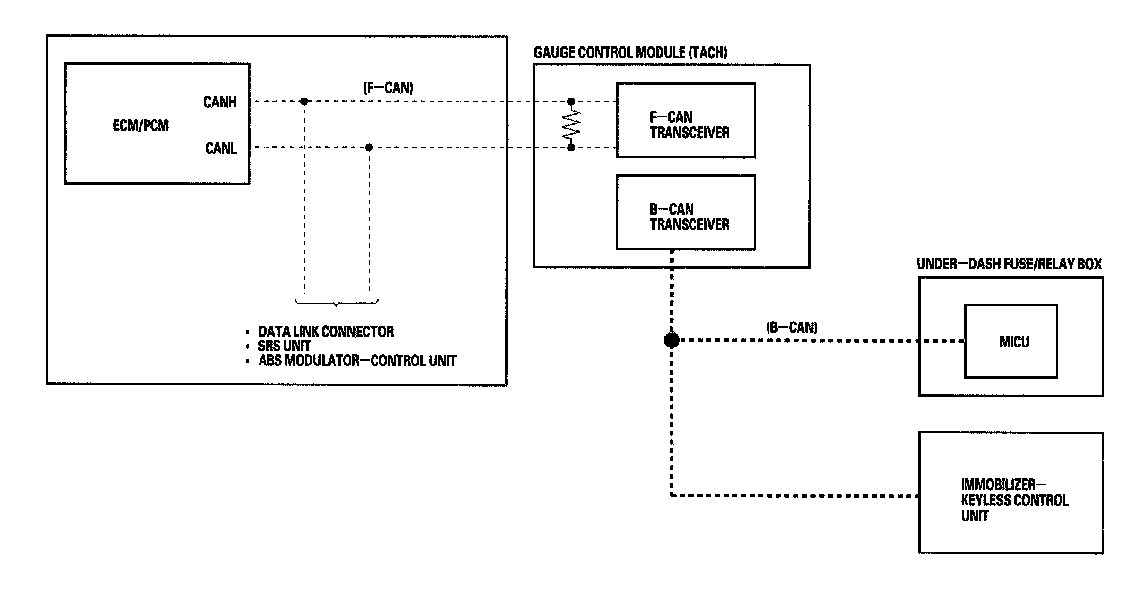 The body controller area network (B-CAN) and the fast controller area network (F-CAN) share information between multiple electronic control units (ECUs). B-CAN communication moves at a slower speed (33.33 kbps) for convenience related items and for other functions. F-CAN information moves at a faster speed (500 kbps) for "real time" functions such as fuel and emissions data. To allow both systems to share information, the gauge control module translates information from B-CAN to F-CAN and from F-CAN to B-CAN.