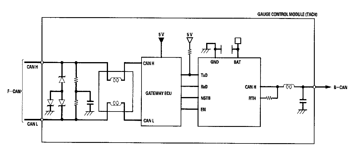 The gauge control module (tach) acts as a gateway to allow both systems to share information, the gauge control module translates information from B-CAN to F-CAN and from F-CAN to B-CAN.