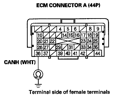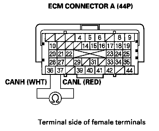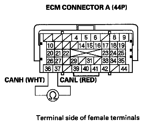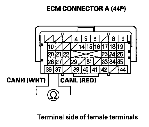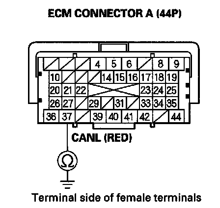 35. Measure resistance between ECM connector terminals A36 and A37.